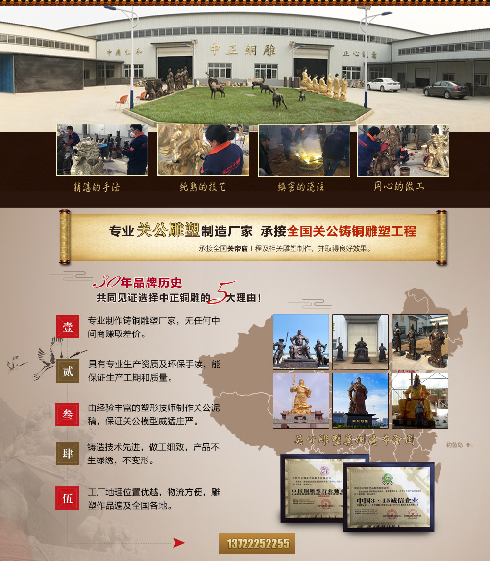 河北中正銅工藝品制造有限公司是一家具有獨立設(shè)計、雕塑、鑄造、制作施工能力的單位。擁有完善的,大型的,先進的生產(chǎn)設(shè)備,并由多位經(jīng)驗豐富的高級鑄造技師指導生產(chǎn)及制作。公司主要鑄造銅關(guān)公,九龍銅關(guān)公,福建銅關(guān)公,臺灣銅關(guān)公,關(guān)羽雕塑,鑄銅關(guān)公,銅雕關(guān)公,1米銅關(guān)公,2米銅關(guān)公等,可按客戶提供動物銅雕圖片訂做加工銅關(guān)公,九龍銅關(guān)公,做工精美,質(zhì)量保證。
